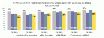 When looking at success measures for new first-time, full-time students at Northeastern, it has been found that students who are both first generation and PELL eligible tend to fall behind their peers in first semester GPA and the percentage of credits earned.